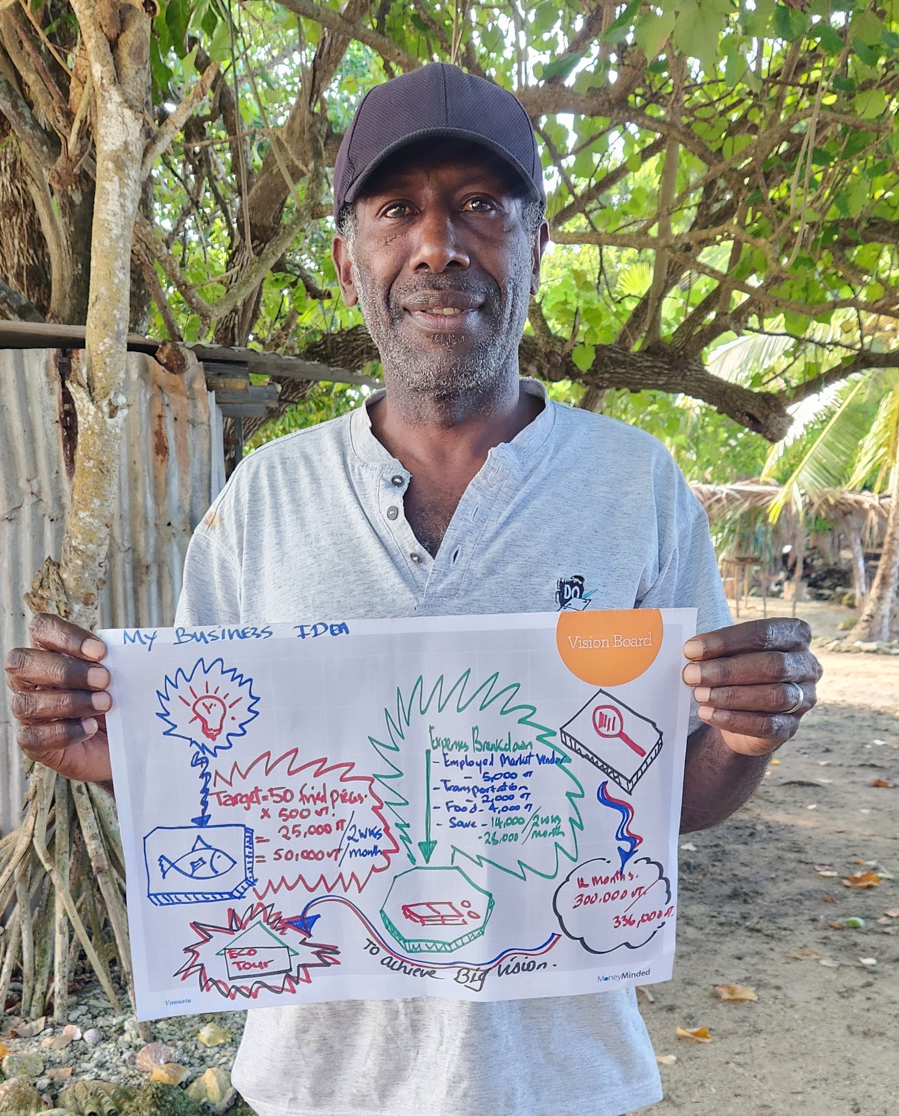 In August 2024, Willie attended the Money Minded Financial Literacy and Business Basics trainings in Tanoliu, Vanuatu, supported by the USP component of the Pacific European Union Marine Partnership (USP PEUMP) programme, funded by the European Union and the Government of Sweden. The training opened his eyes to new ways of thinking about money, savings, and planning. Among the many lessons, one stood out for Willie: the creation and use of a vision board. He developed a vision board of his passion and dream; to build and run a business on coral restoration and tours.