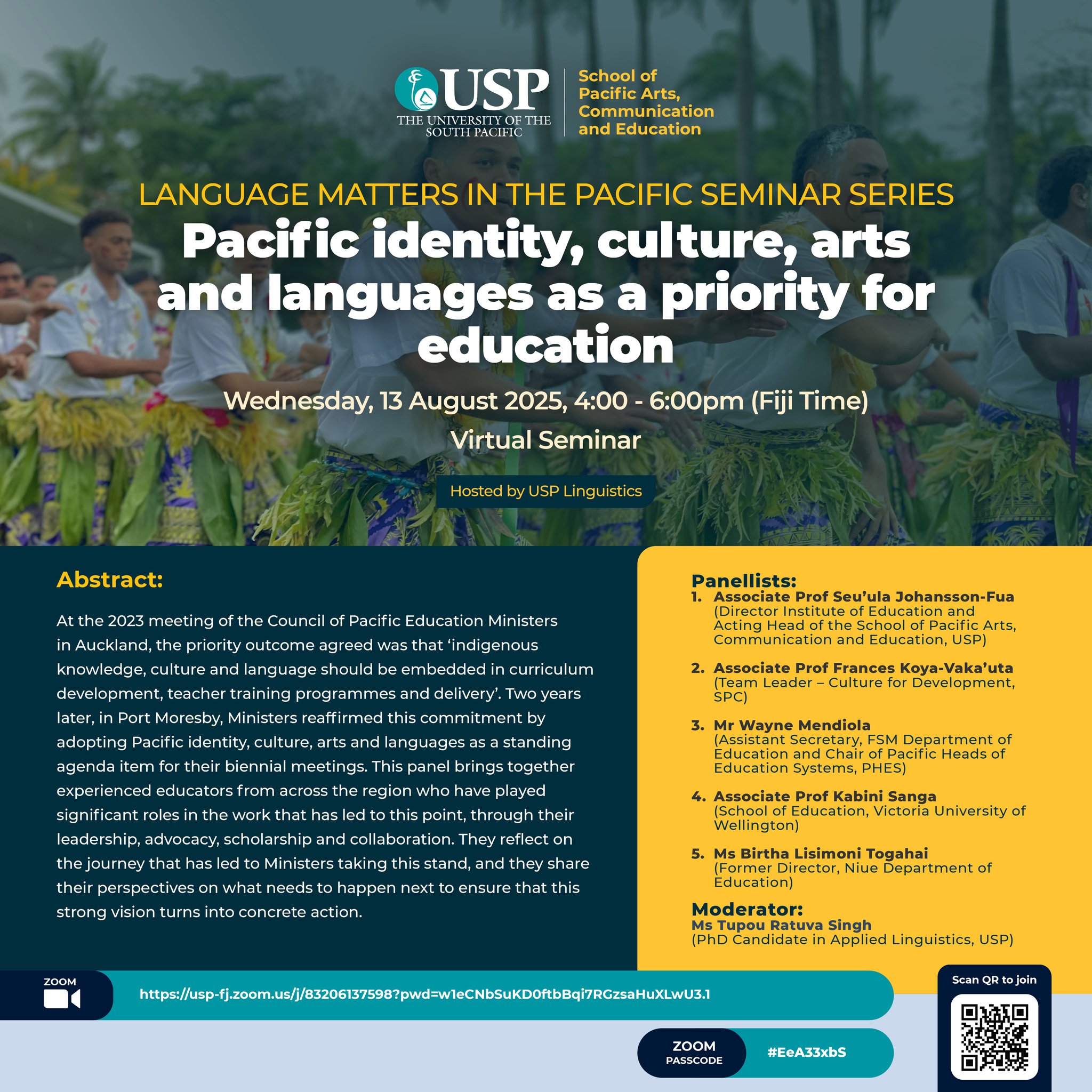 The first session (13 August) brings together a stellar line up of Pacific educators – Associate Prof Seu’ula Johansson-Fua (Director, Institute of Education and Acting Head of the School of Pacific Arts, Communication and Education, USP),  Associate Prof Frances Koya-Vaka’uta (Team Leader, Culture for Development, SPC), Mr Wayne Mendiola (Assistant Secretary, FSM Department of Education and Chair of Pacific Heads of Education Systems), Associate Prof Kabini Sanga (School of Education, Victoria University of Wellington), and Ms Birtha Lisimoni Togahai (Former Director, Niue Department of Education) – to discuss the commitment by regional Ministers of Education to prioritising identity, culture, arts and languages in education.