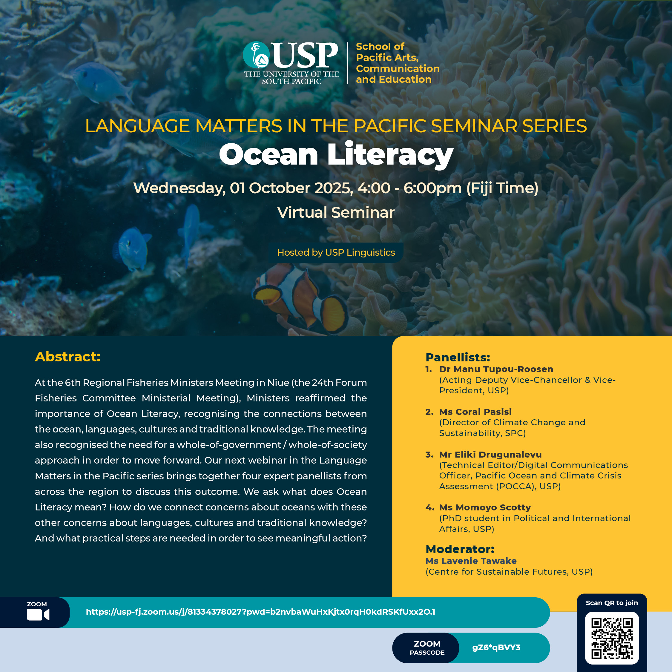 Our final webinar of the USP year is held on 1 October, focused on ocean literacy. This session brings together Dr Manu Tupou-Roosen (Acting Deputy Vice-Chancellor, USP), Ms Coral Pasisi (Director of Climate Change and Sustainability, SPC), Mr Eliki Drugunalevu (Technical Editor and Digital Communications Officer, Pacific Ocean and Climate Crisis Assessment (POCCA), USP) and Ms Momoyo Scotty (PhD student in Political and International Affairs, USP). The webinar is moderated by Ms Lavenie Tawake from USP’s Centre for Sustainable Futures.