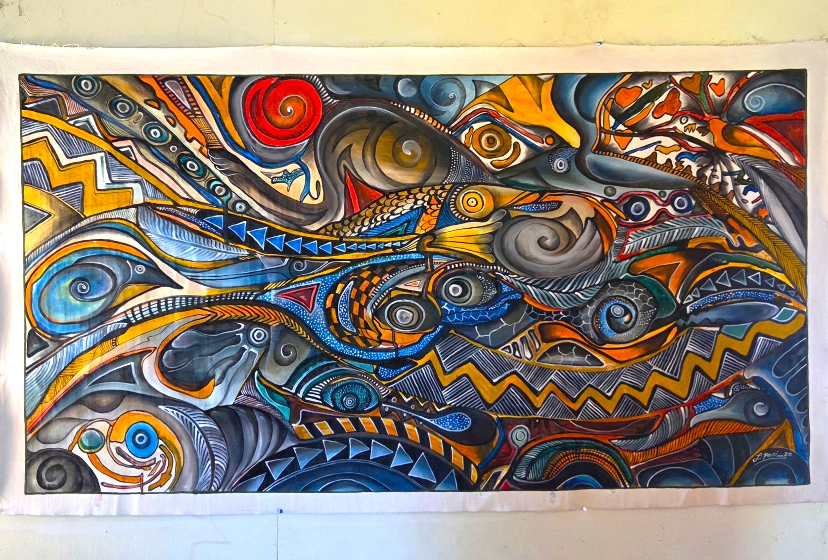 “This piece came from the students’ ideas. I just controlled them with the colours. So, from all those small ideas, just from the conversations in this room, you get what is drawn within these borders. The composition on Open Day was all about your joy, all about your goals and how you can bridge from secondary to university level. From those ideas, to come up with this, it’s like a journey,” Peni added.